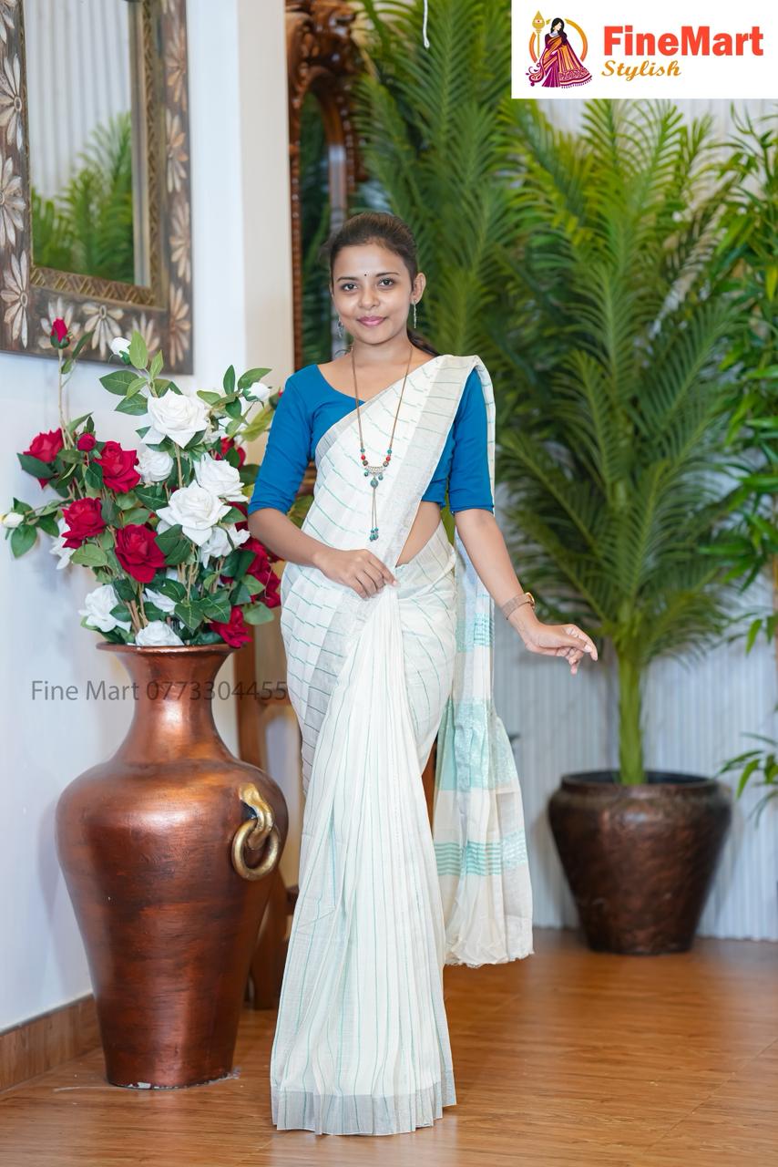 PURE WHITE SAREE WITH LINES AND SILVER BORDER